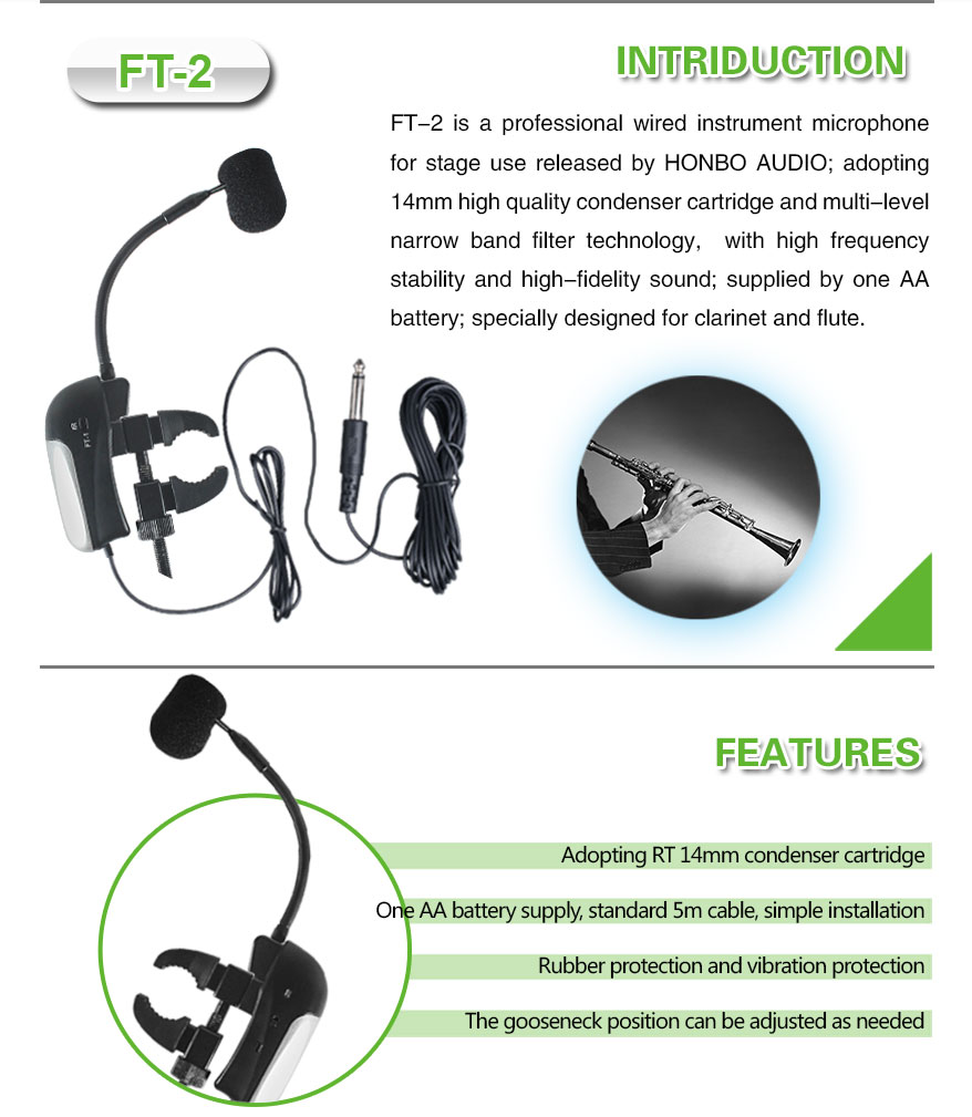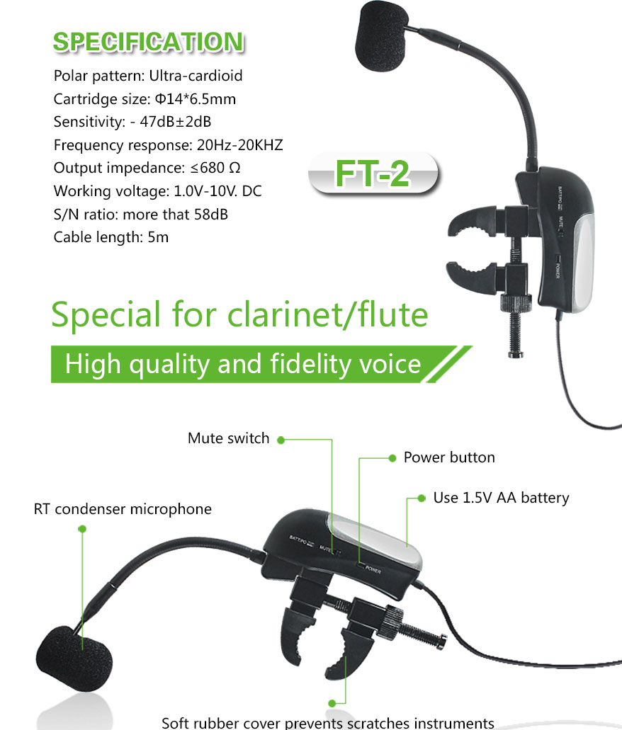 The FT-2 is a high-quality wired flute microphone, designed to capture the full range of your woodwind instruments with exceptional clarity and precision. Perfect for flute players, this wired flute microphone ensures your music is faithfully reproduced in live performances, studio recordings, and practice sessions.Featuring a tailored frequency response and cardioid pickup pattern, the FT-2 wired flute microphone isolates your instrument’s sound while minimizing ambient noise. Its lightweight and secure mounting system provides a stable connection without compromising your instrument’s acoustics.