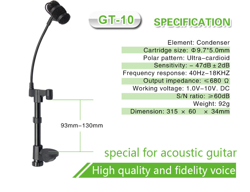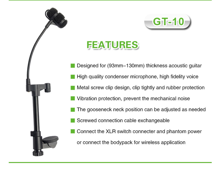 Enhance your acoustic guitar performance with the GT-10, a high-quality wired  acoustic guitar microphone designed to capture the rich, resonant tones of your instrument with precision. Whether you're performing live or recording in the studio, this wired acoustic guitar microphone delivers clear, accurate sound that highlights the natural character of your guitar.